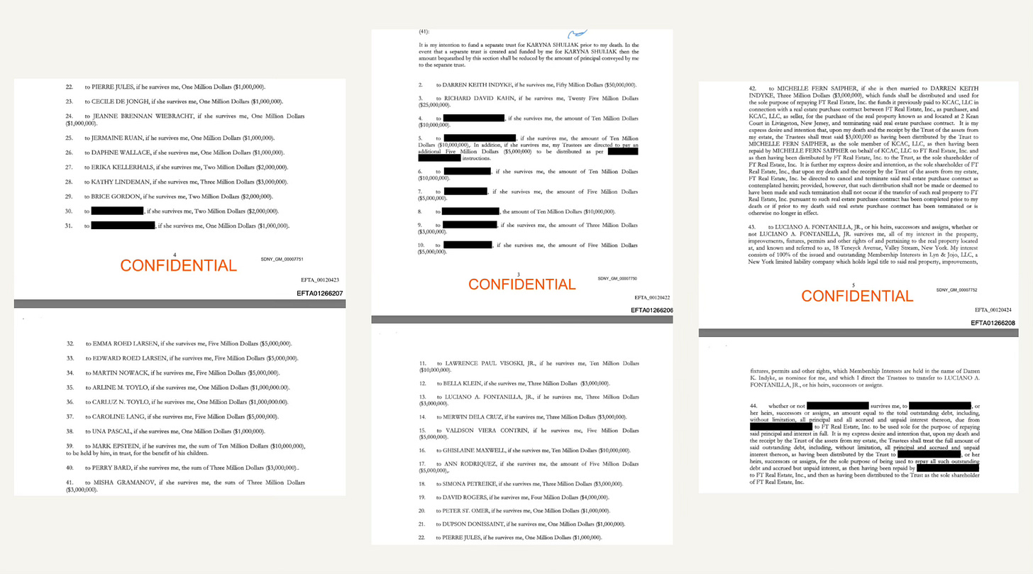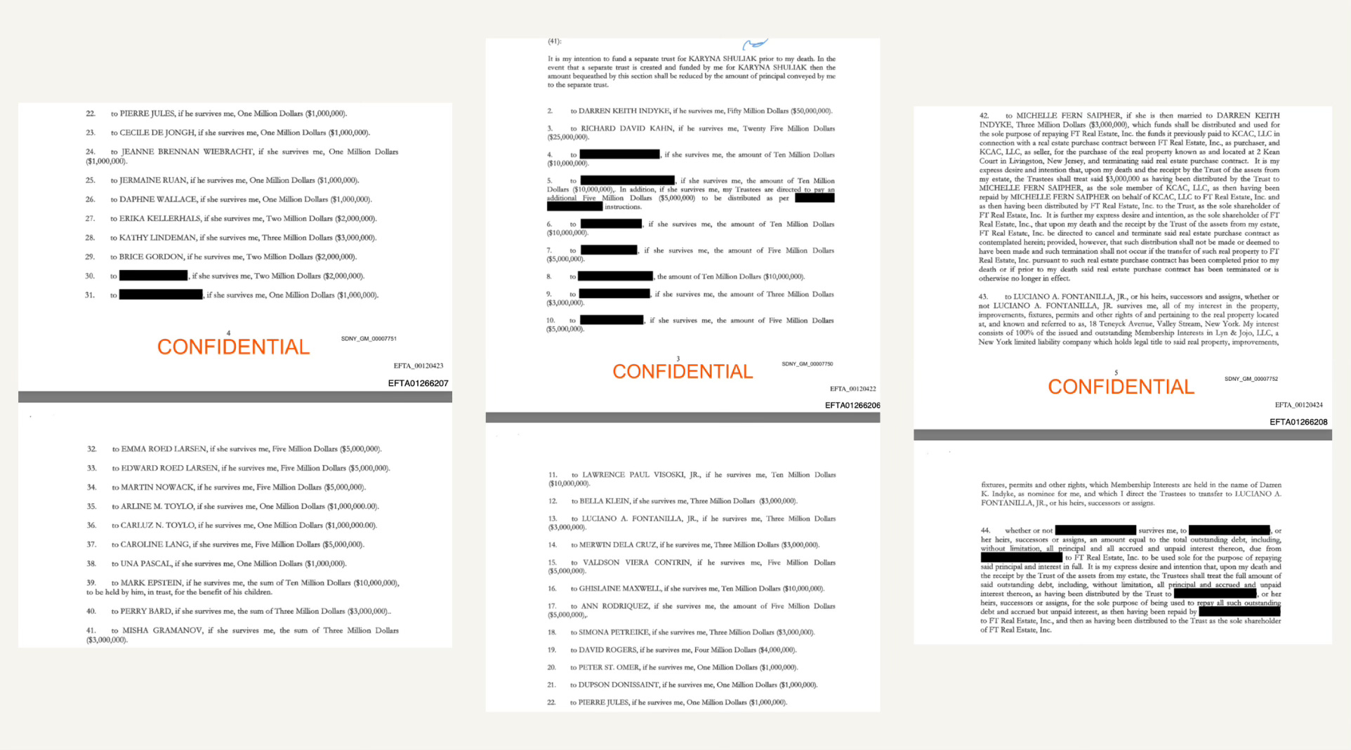 The Will directs the estate to give his long-time girlfriend, Karyna Shuliak, $100 million, including $50 million to be set up as an annuity for Shuliak. In addition to the money, she was set to inherit most of Epstein’s properties and a 33-carat diamond ring.