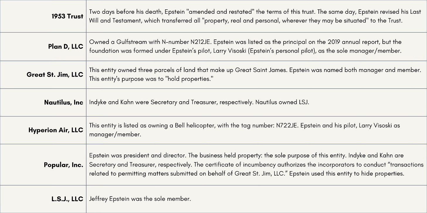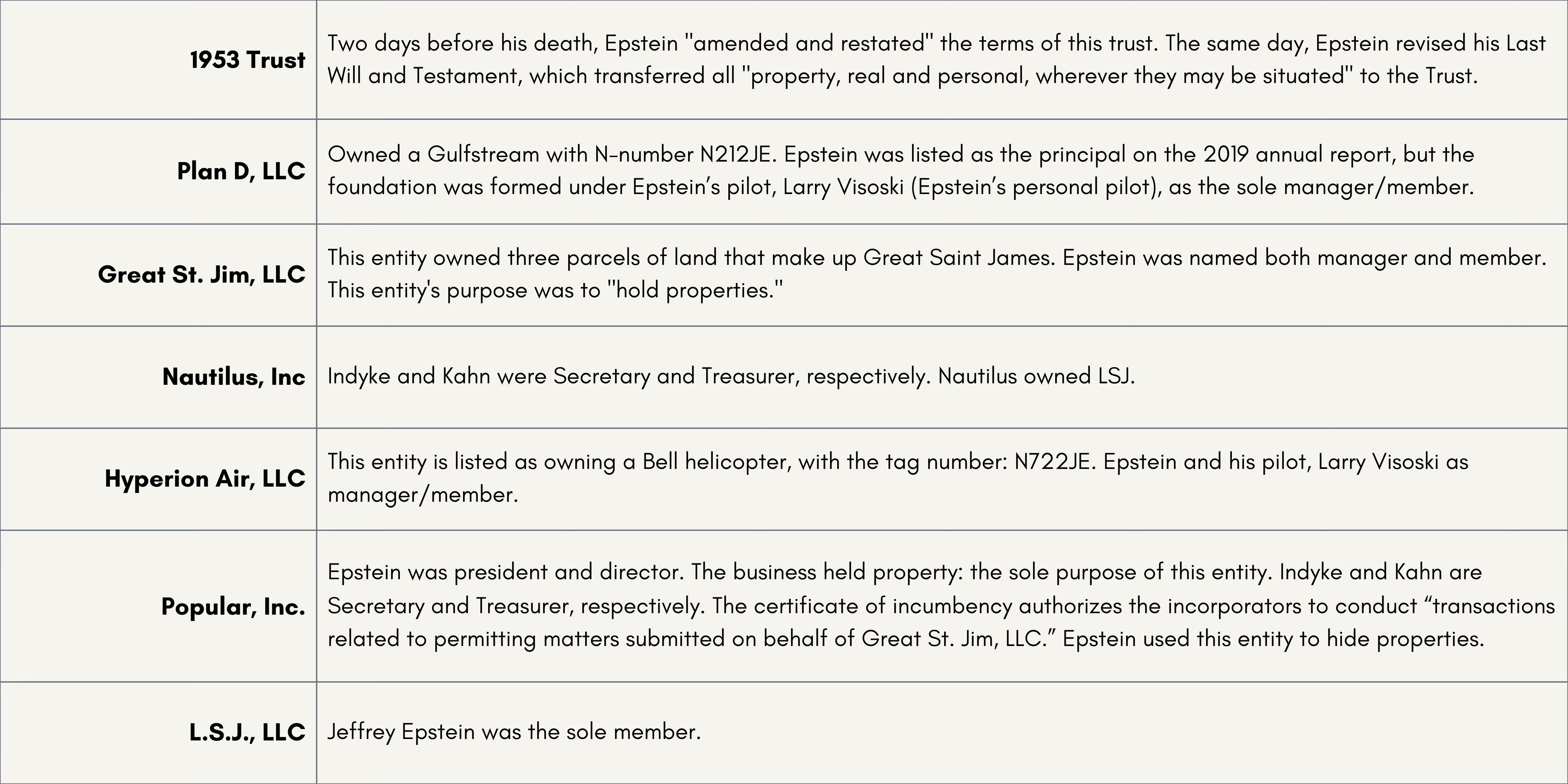 Below is a partial list of entities tied to Epstein and what each one controlled. Notice how aircraft, property, and even the island itself were separated into different legal shells — but often managed by the same small circle of people.