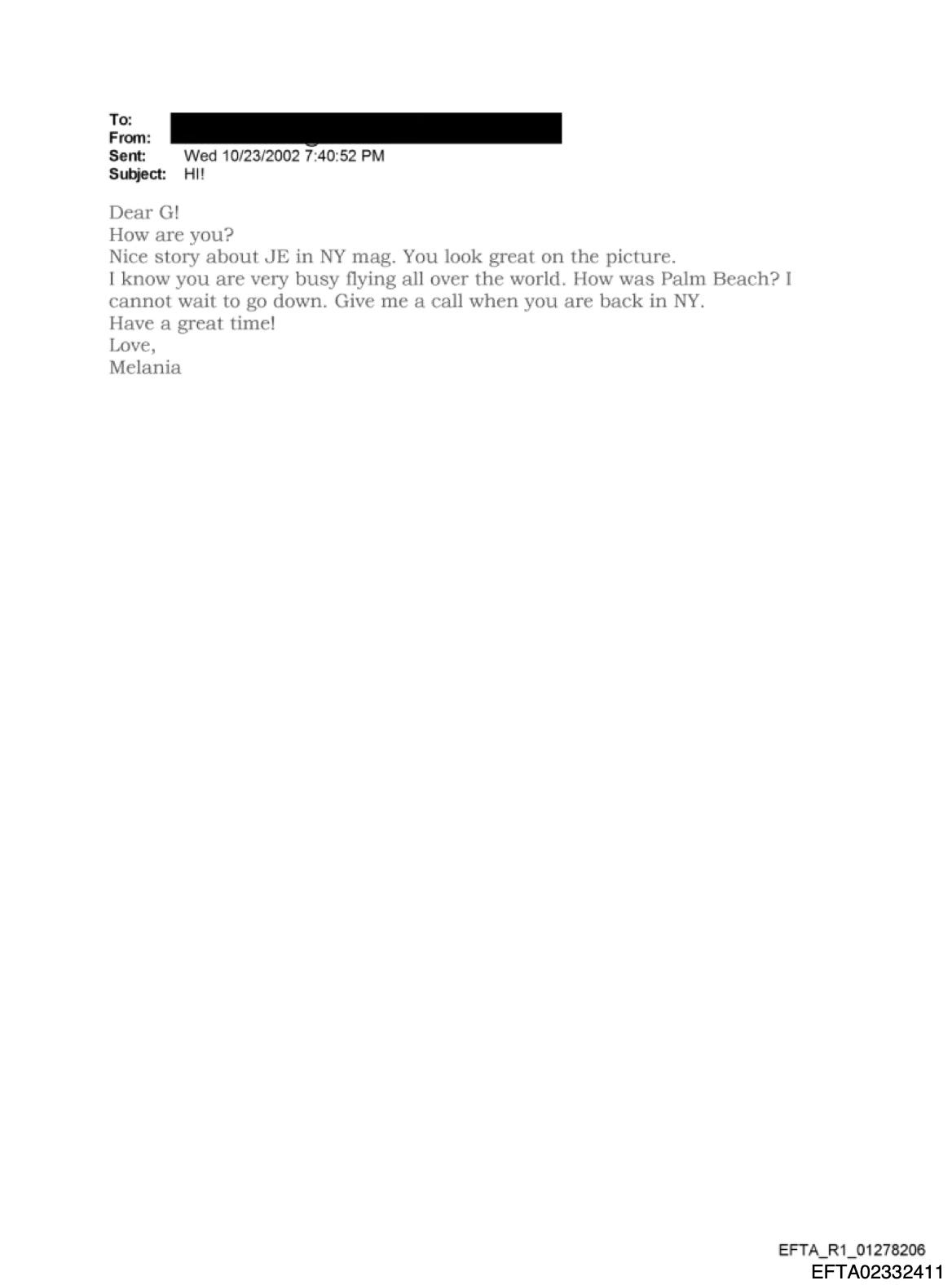 It reads: “Dear G! How are you? Nice story about JE in NY mag. You look great on the picture. I know you are very busy flying all over the world. How was Palm Beach? I cannot wait to go down. Give me a call when you are back in NY. Have a great time! Love, Melania.”
